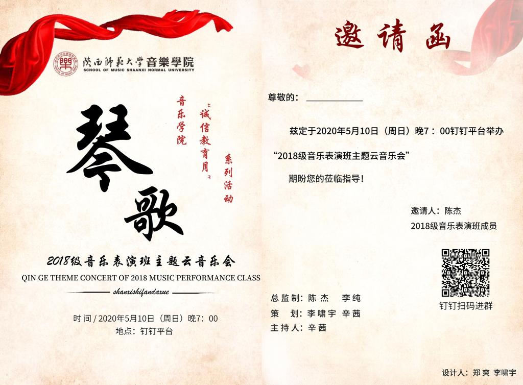 为了做好本科生诚信教育工作,促进学风建设,发扬西部红烛精神,5月10日,云顶国际官网入口2018级音乐表演班在钉钉平台开展了“诚信教育活动月”系列活动之“琴歌”云音乐会。我校党委学工部(学生处)部(处)长蒋毓新,我校云顶国际官网入口党委副书记范玮熠,河南大学云顶国际官网入口器乐系副主任赵博,我校云顶国际官网入口教师雷倩、杨昊云,辅导员陈杰以及师生代表参加了本次云音乐会,音乐会由辛茜同学主持。