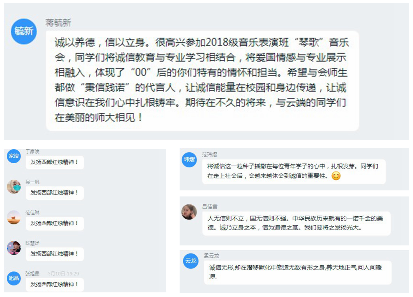 遵守诺言,恪守信用,诚信是一切价值的根基。通过本次主题云音乐会的举办,同学们将专业学习与诚信教育深度结合,将诚信原则内化于心,外化于行,通过自己的努力奋斗发扬西部红烛精神。
